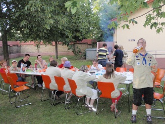 Schwer bepackt mit Schlafsack, Isomatte und süßen Leckereien haben wir uns um 18 Uhr getroffen. Begonnen haben wir damit, die Salate für das Grillen gemeinsam vorzubereiten. Im Garten wurde dann gegrillt und an einem großen Tisch gegessen.