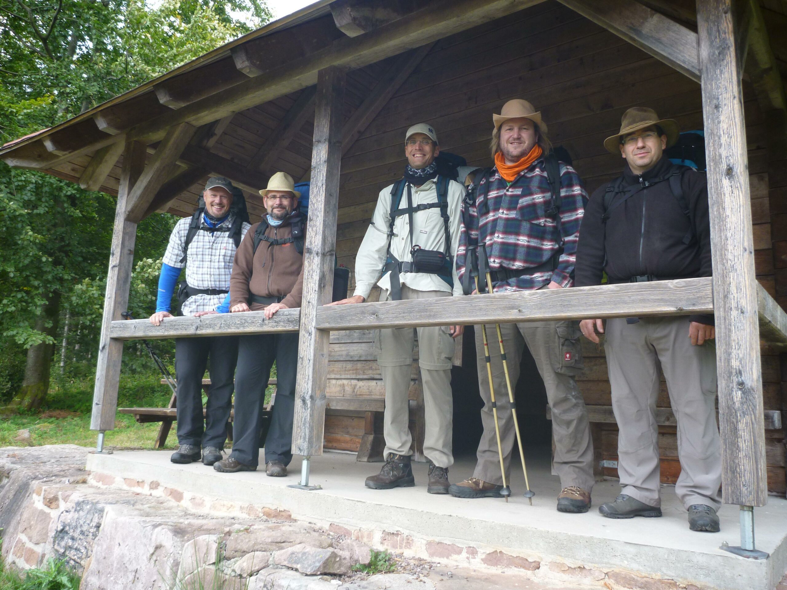 Der Weg führte uns weiter zur Hilseckhütte in deren Umgebung sich der erste Punkt der Operation Birgit befand. Wir nutzten die sehr schönen Außenanlagen der Hütte erstmal für eine kurze Pause bevor sich die Gruppe auf die Suche begab. Mit Hilfe von GPS und einigen Hinweisen war die Stelle schnell ausgemacht und eine Partydose Rothaus Pils konnte aus dem Versteck im Wald geborgen werden. Diese hatten Weize und Oger eine Woche zuvor bei einer geheimen Vortour dort versteckt. Bis zu unserem Tagesziel, der Hütte am Schäfersfeld-Pass lagen noch ein paar Kilometer vor uns. Wir erreichten unser Ziel beim Hereinbrechen der Dämmerung. Die Anstrengungen des ersten Tages standen allen ins Gesicht geschrieben aber nach einem Verschnaufen und Wiederauffüllen der Energievorräte konnte der gemütliche Teil des Abends beginnen.