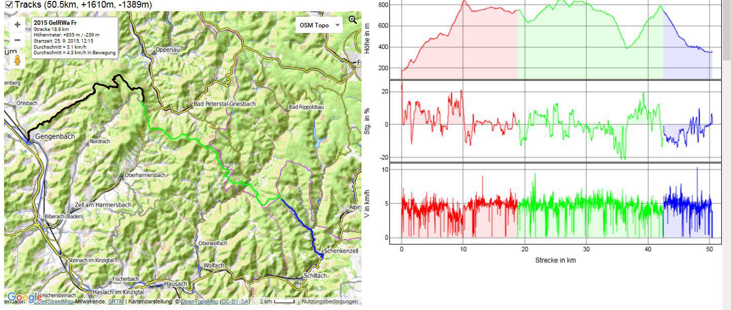 Am Ochsen in Schapbach angekommen ging es dann darum das V im Höhenprofil zu vervollständigen. D.h. die knapp 350 hm Abstieg standen nun auf der anderen Seite des Tals als Aufstieg auf dem Programm. Schön zu sehen am Ende des Höhenprofils des zweiten Tages (grün).