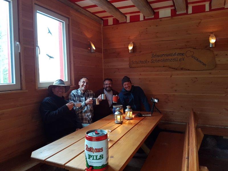Alle waren von der “Komforthütte” mit integrierter Grillstelle und dem schönen Ausblick über das Kinzigtal angetan. Nach einer kurzen Verschnaufpause sollte es dann erstmal darum gehen die beiden “Birgits” zu finden und zu klären, was es mit der zweiten Birgit auf sich hat. Hier machte sich das Fehlen von Michel bei der diesjährigen Tour deutlich bemerkbar. Oger und Weize mussten die Suchenden nahezu zu den Verstecken geleiten, sonst würden wir wahrscheinlich heute noch dort festsitzen. Zurück an der Hütte konnte dann auch das Geheimnis um Birgit 2 gelüftet werden. Es handelte sich dabei um 8 Liter Trinkwasser. Klingt zwar unspektakulär, aber jeder Hüttenwanderer kann sicherlich nachvollziehen wie wertvoll das sein kann.