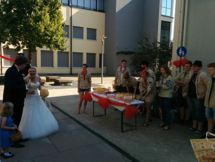 WeiterlesenAm Freitag haben unsere langjährige Leiterin Jessica und unser aktueller Stammesvorstand Sven sich ihr Ja Wort gegeben. Natürlich waren wir als Stamm auch dabei, nicht nur eingeladen, sondern auch mit Spalierstehen und Sektempfang 🙂 Wir wünschen Jessica und Sven Alles Gute!
